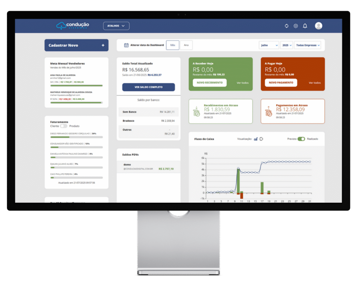 Com a Condução Sistemas, você cuida das vendas, do financeiro e do estoque em um só lugar, tudo 100% online, seguro e sempre disponível.